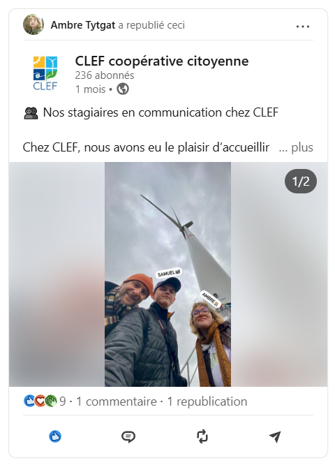 Mon stage en relations publiques au sein de la coopérative CLEF m’a permis de relier communication et engagement. J’ai appris à valoriser des projets concrets autour des énergies renouvelables, à dialoguer avec différents publics et à concevoir des outils qui rendent accessible un sujet complexe. Cette immersion m’a montré comment les relations publiques peuvent faire circuler des idées, mobiliser, donner du sens à l’action collective.